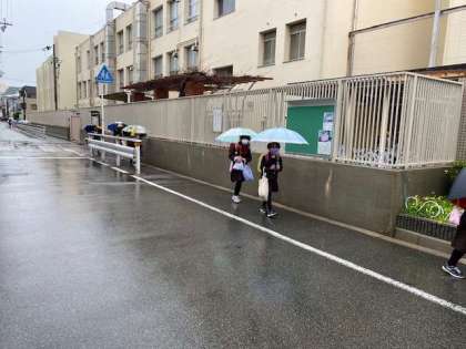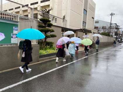 今日と明日の2日間、試行期間として南門からの登下校としています。少し感覚が違ってきますが、冷たい雨の中、元気に登校してきています。