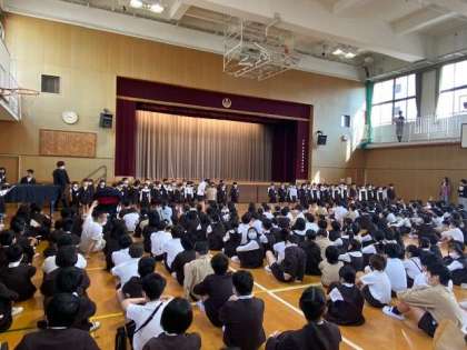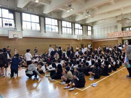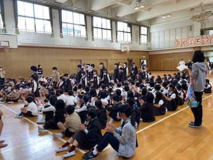 6年生と一緒に講堂に入場。皆さんから拍手でお出迎えです。上級生のお兄さん、お姉さん、よろしくお願いします。