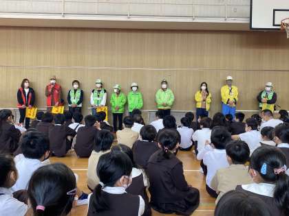 毎日、登下校時に通学路に立ち、子どもたちに挨拶しながら自動車や自転車からの事故防止のため、ご尽力いただいている「見守り隊」「青色防犯パトロール」「PTA青少年委員」の皆さんを紹介しました。