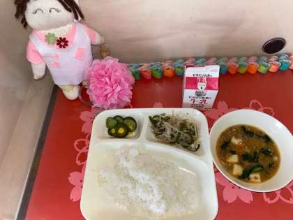 今日の給食は、マーボー豆腐、きゅうりとコーンの甘酢和え、もやしとピーマンのごま炒めです。