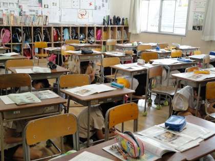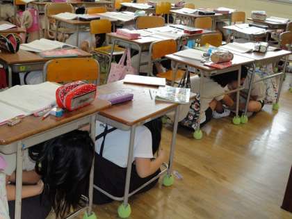 4年生では、一斉放送の合図とともに机の下に隠れるなどの訓練を行いました。
