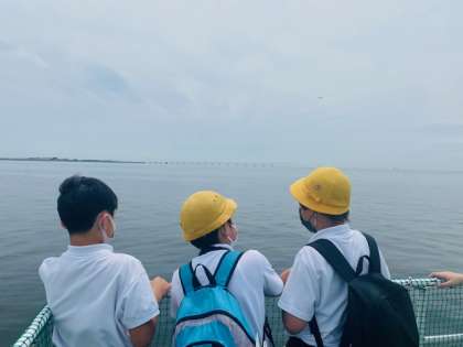 神戸空港の近くまで来ました。船からは、神戸空港から飛行機やヘルコプターが飛び立つところや、淡路島や明石海峡大橋、海から望む神戸や大阪の街並みを見ることができました。