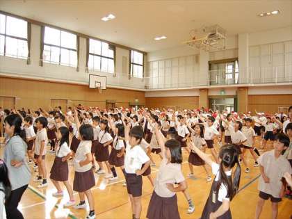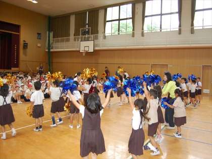 後半は、全学年を対象に、いよいよ「チアダンス」の体験です。部分的に少しずつ教えていただいた後、チアダンスではおなじみの「Micky」という曲に合わせてダンスを行いました。低学年の児童はもちろん、高学年の児童も楽しく元気におどっていました。