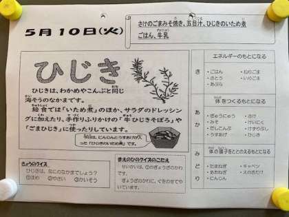 今日の給食は、鮭の胡麻味噌焼き、五目汁、ひじきの炒め煮です。