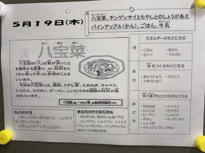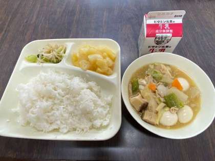 今日の給食は、八宝菜、チンゲンサイともやしとの生姜和え、パインアップルです。