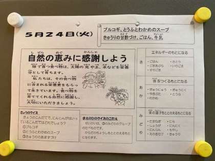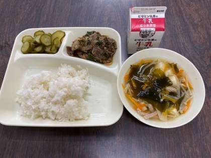 今日の給食は、プルコギ、豆腐とワカメのスープ、きゅうりの甘酢漬けです。