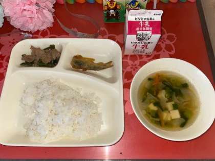今日の昼食は、イワシ天ぷら、五目汁、豚肉とサンド豆の炒め物です。