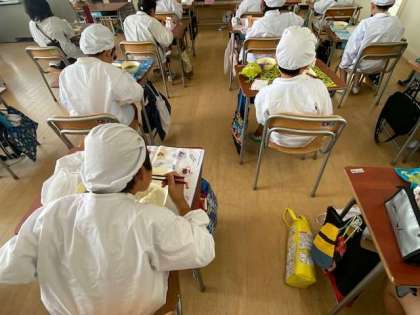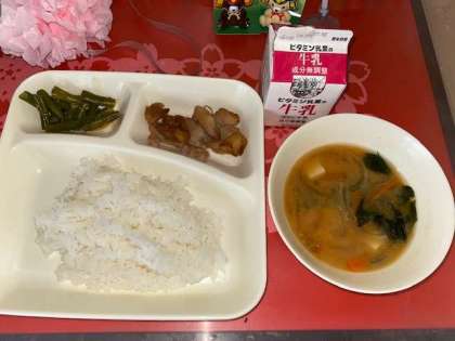 今日の昼食は、鶏肉の醤油バター焼き、豆腐の味噌汁、三度豆の胡麻和えです。