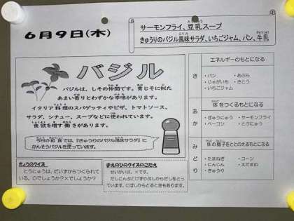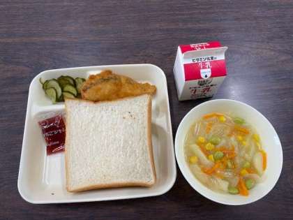 今日の給食は、サーモンフライ、豆乳スープ、きゅうりのバジル風味サラダです。