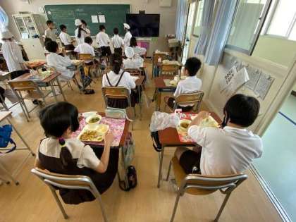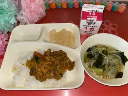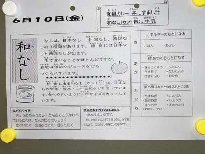 今日の給食は、和風カレー丼、すまし汁、和なしです。