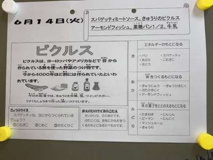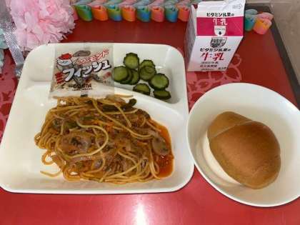 今日の給食は、スパゲッティーミートソース、きゅうりのピクルス、アーモンドフィッシュです。