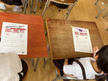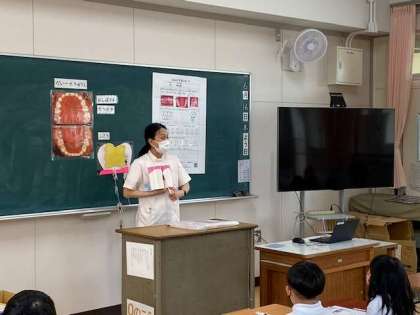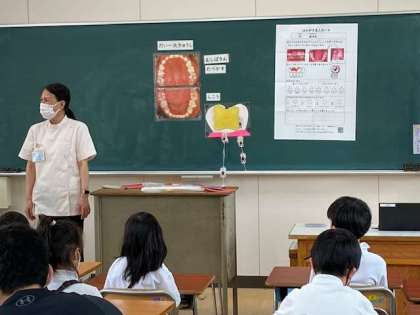 今日は、2年生で歯科衛生士さんをお招きし「歯磨き指導」の授業を行いました。大事な大事な歯。虫歯にならないようにするには?上手な歯磨きの仕方について、模型を使ってわかりやすく教えていただきました。「歯垢が残らないように歯磨きします」歯みがき名人カードにまとめていきました。(^-^)