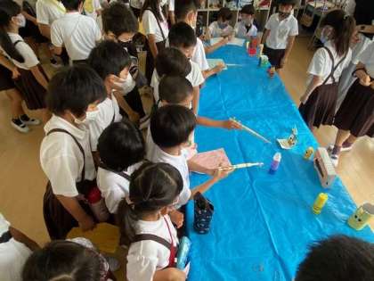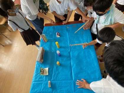 割り箸で作った鉄砲で輪ゴムを飛ばします。うまく倒せるかな?
