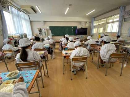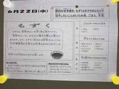 今日の給食は、豚肉の甘辛焼き、もずくとオクラのとろり汁、切干し大根の炒め煮です。