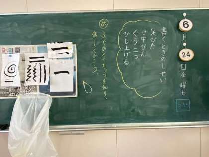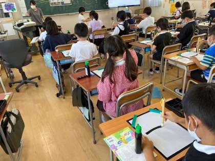 初めての書写授業です。まずは、筆使いに慣れます。ぐるぐる渦巻きを書いてみましょう!