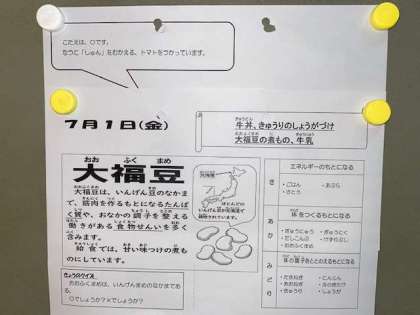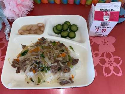 今日の給食は、牛丼、きゅうりの生姜漬け、大福豆の煮物です。