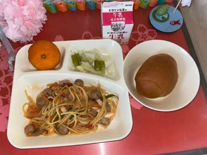 今日の給食は、チキントマトスパゲティー、グリーンアスパラガスとキャベツのサラダ、冷凍みかんです。