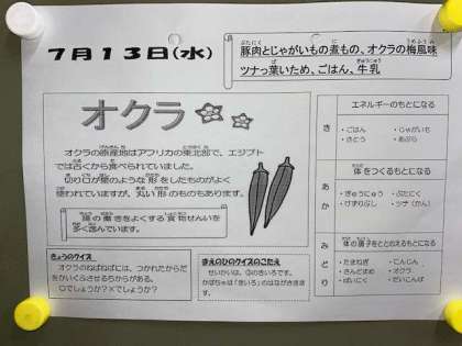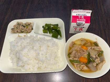 今日の給食は、豚肉とジャガイモの煮物、オクラの梅風味、ツナっぱ炒めです。