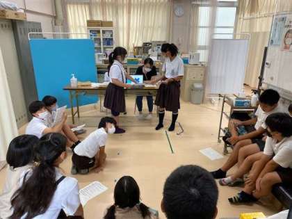 お昼の時間を使って、保健美化委員会が、終業式の時に行うクイズの打ち合わせとリハーサルを行っています。