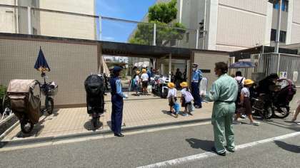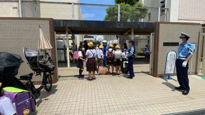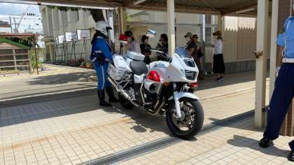 夏休み前に、此花警察署交通課のお巡りさんが、子どもたちに交通安全の呼びかけをしていただきました。子どもたちは、学校にやってきた白バイを見て感激。目の前で見る機会はなかなかありません。交通課の皆さん、暑い中、本当にありがとうございました。