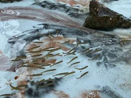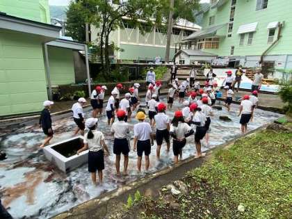 魚は、いろんな方向に逃げて行きます。結構難しい!水が冷たいので、「キヤー。冷たーい。」と言いつつ、魚を捕まえています。