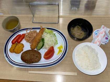 夕食です。ハンバーグとエビフライの定食です。おいしくいただきましょう!