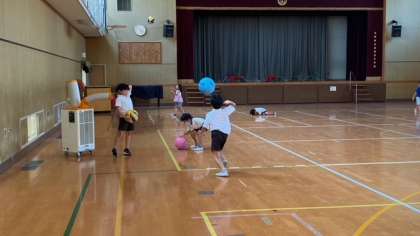 のぞいてみると、いきいき活動でソフトバレーボールで遊んでいる子どもたちを発見!窓と扉を全開にして、さらにスポットクーラーと扇風機を使い、熱中症とコロナ感染症対策を講じて活動!つい校長先生も一緒に遊んでしまいました。(汗ダクダクです、、、)