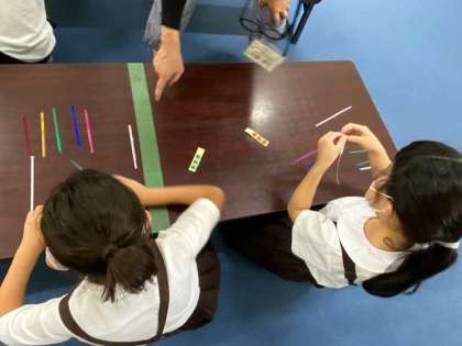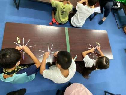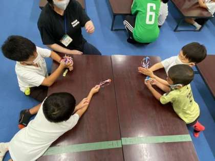 チャレンジタイムでは、ストローと細く切ったピカピカフィルムを使って、手作りおもちゃを作りました。細かい作業なので難しかったですが、皆さん、上手に仕上げました(^ν^)