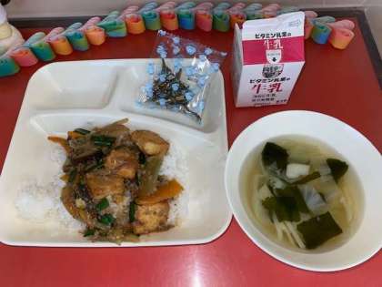 今日の給食は、マーボー厚揚げ丼、中華スープ、ミニフィッシュです。