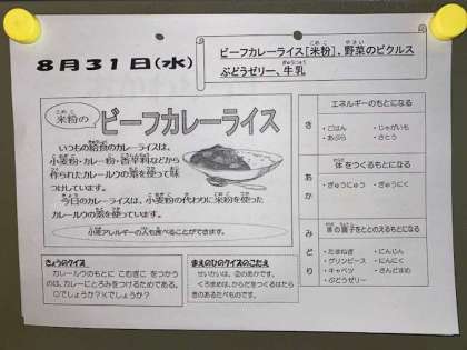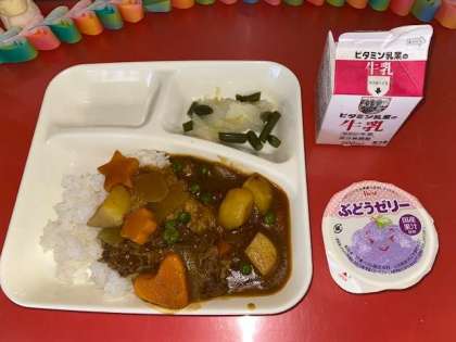 今日の給食は、ビーフカレーライス、野菜のピクルス、ぶどうゼリーです。