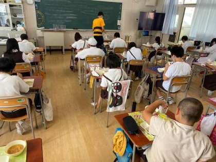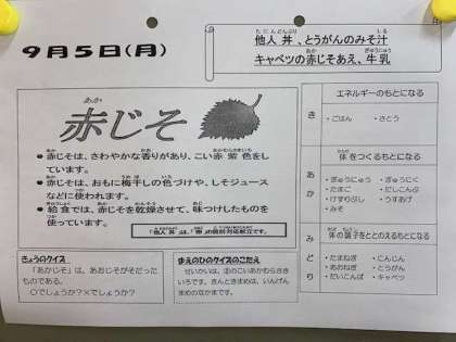 今日の給食は、他人丼、冬瓜の味噌汁、キャベツの赤じそ和えです。