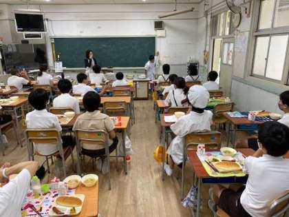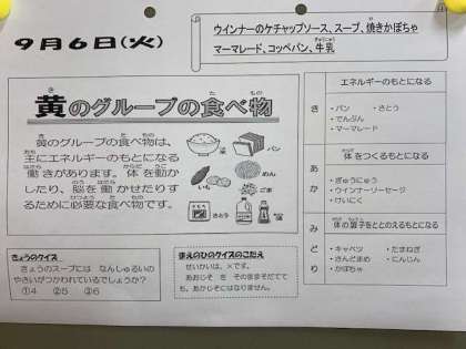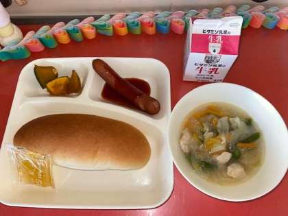 今日の給食は、ウインナーのケチャップソース、スープ、焼きかぼちゃです。