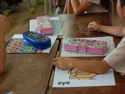 総合的な学習の時間を活用し、4月から少しずつ英語活動に取り組んできています。歌やチャンツ、ゲーム等子どもが楽しくスムーズに慣れ親しめる活動を工夫してきました。