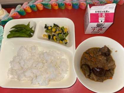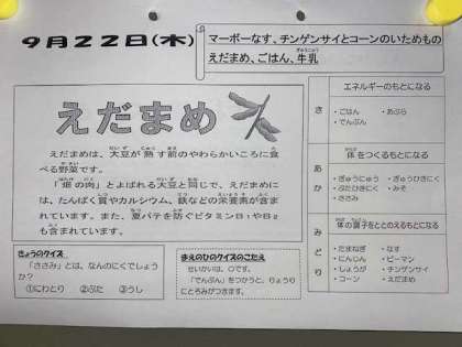 今日の給食は、マーボー茄子、青梗菜とコーンの炒め物、枝豆です。