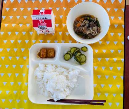 今日の給食は、肉じゃが、厚揚げの味噌だれかけ、きゅうりのゆずの香あえでした。どれも人気で、たくさんの子どもたちがおかわりをしていました。