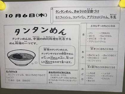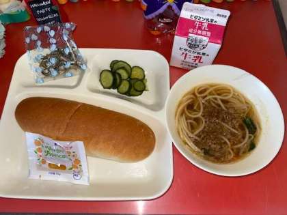 今日の給食は、タンタン麺、きゅうりの甘酢漬け、ミニフィッシュです。