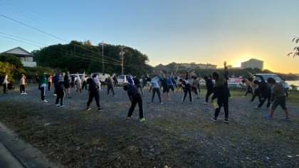司会、係の皆さんから挨拶があり、恒例の「ラジオ体操」です。