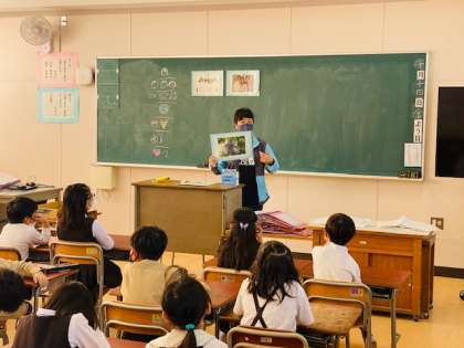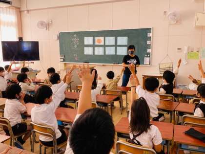 2年生の児童を対象に、外国人英語講師のジンギー先生による外国語学習を行いました。子どもたちは、「Family」「Earth」「Pizza」「Pets」「Fried chicken」などの英語を声に出しながら、楽しく学んでいました。