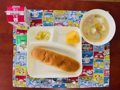 今日の給食は、豆乳コーンクリームシチュー、白菜のピクルス、柿でした。柿は「平核無柿(ひらたねなしかき」という品種で、種が無くて食べやすく、秋の味覚を味わいました。