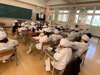 今日の給食は、もずくと豚ひき肉のジューシー、サツマイモの味噌汁、焼きれんこんです。