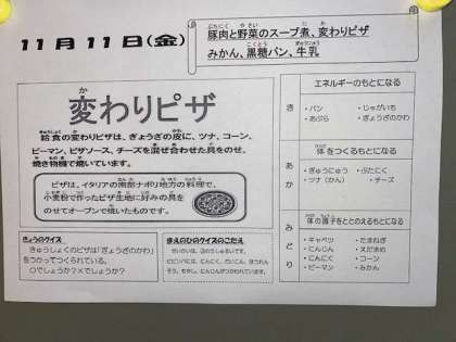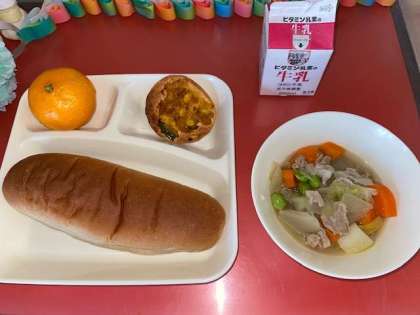 今日の給食は、豚肉と野菜のスープ煮、変わりピザ、みかんです。