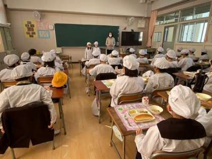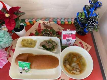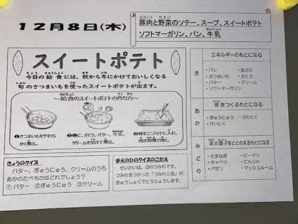 今日の給食は、豚肉と野菜のソテー、スープ、スイートポテトです。