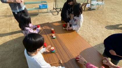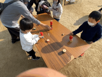 だるま落としコーナーでは、こづちでたたく「ノーマルタイプ」も遊べます。勢いよくたたくと、カーンといい音が鳴って、積み木が飛んでいきます。だるまは落ちなかったですか?