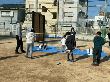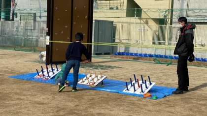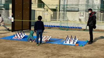 わなげコーナーでは、年齢によって的までの距離を変えて投げます。
