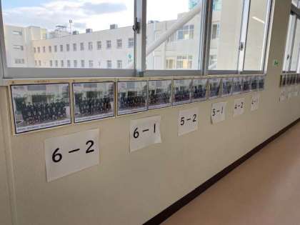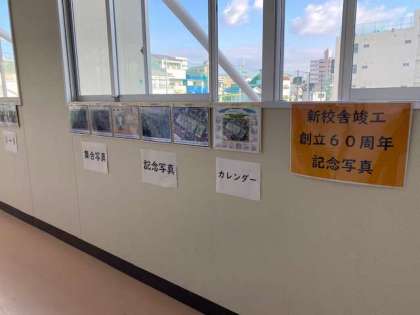 なお、2階の職員室前に、創立60周年と新校舎竣工を記念して撮影した航空写真と学級写真の見本を掲示しております。お越しの際はぜひご覧ください。購入も申し込みできます。
