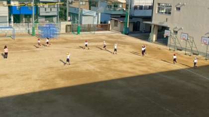 4年生の皆さんが、長距離走を行っています。「5分間持久走」で、何周走れるかを記録します。女子児童がトップを引っ張ります。