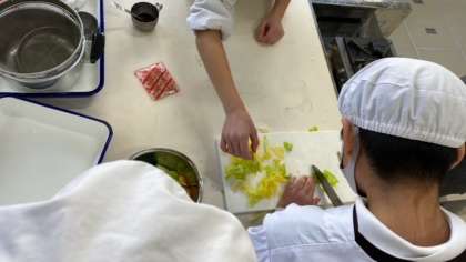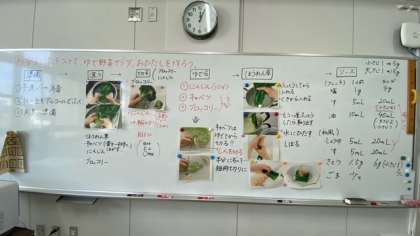 5年生の調理実習で、ゆで野菜サラダとほうれん草のおひたしを作っています。
