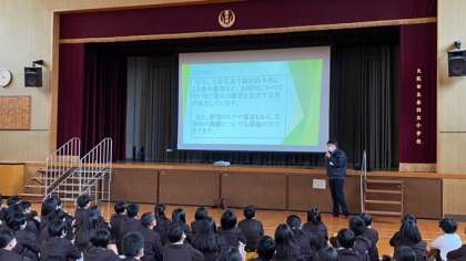 区役所の危機管理担当の方に来ていただき、大震災と津波についてのお話しをスライドを使って学習しました。