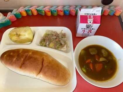 今日の給食は、ミートボールと野菜のカレー煮、ツナとキャベツのソテー、りんごです。