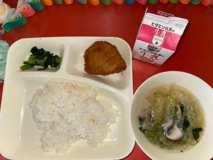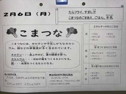 今日の給食は、たらフライ、すまし汁、小松菜の胡麻和えです。